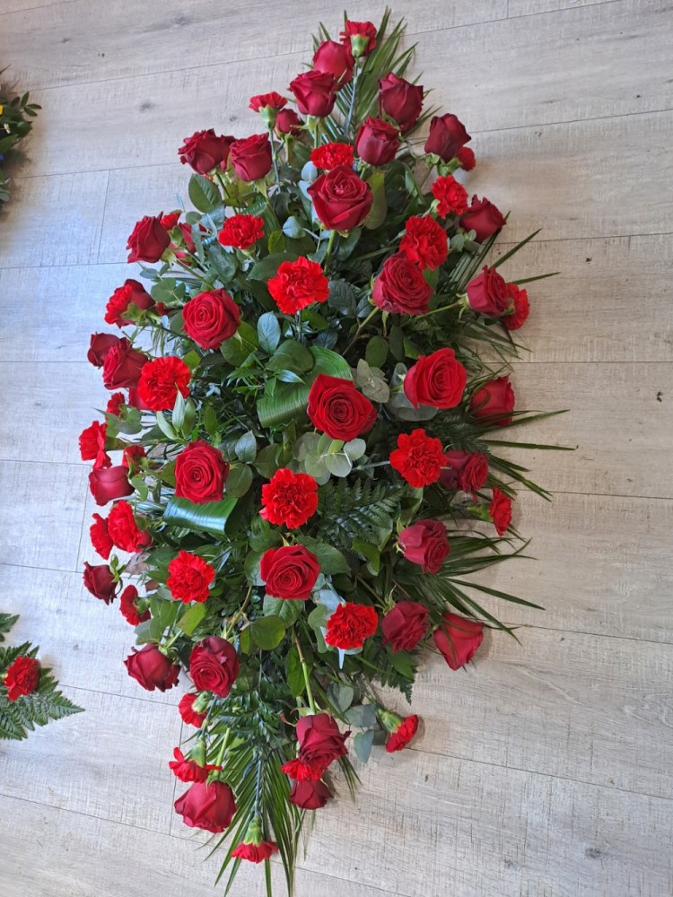 Beautiful mix of roses and carnations to create this elegant casket spray.