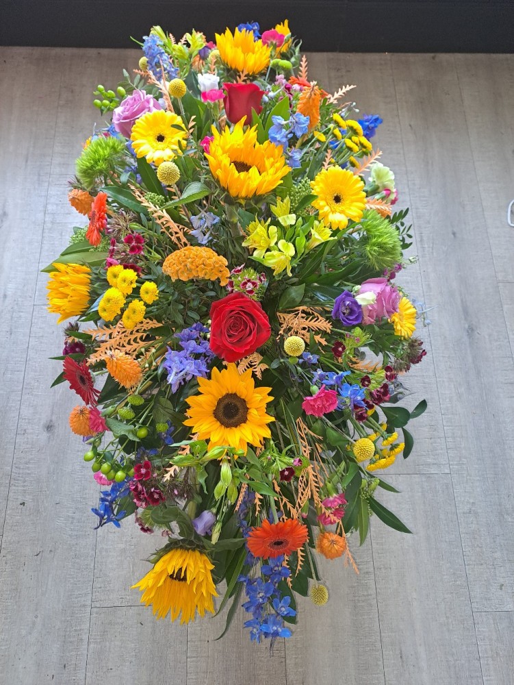 A lovely vibrant casket spray with a mixture of seasonal flowers.
