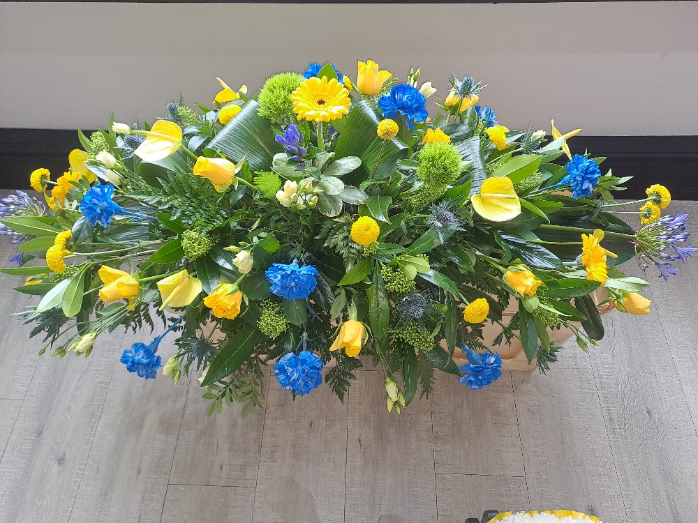 Mixture of yellow and blue seasonal flowers create this Warrington inspired casket spray.