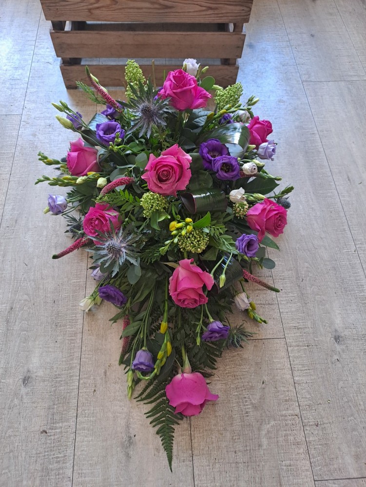 Mixture or cerise, yellow and blue flowers to create this woodland spray.